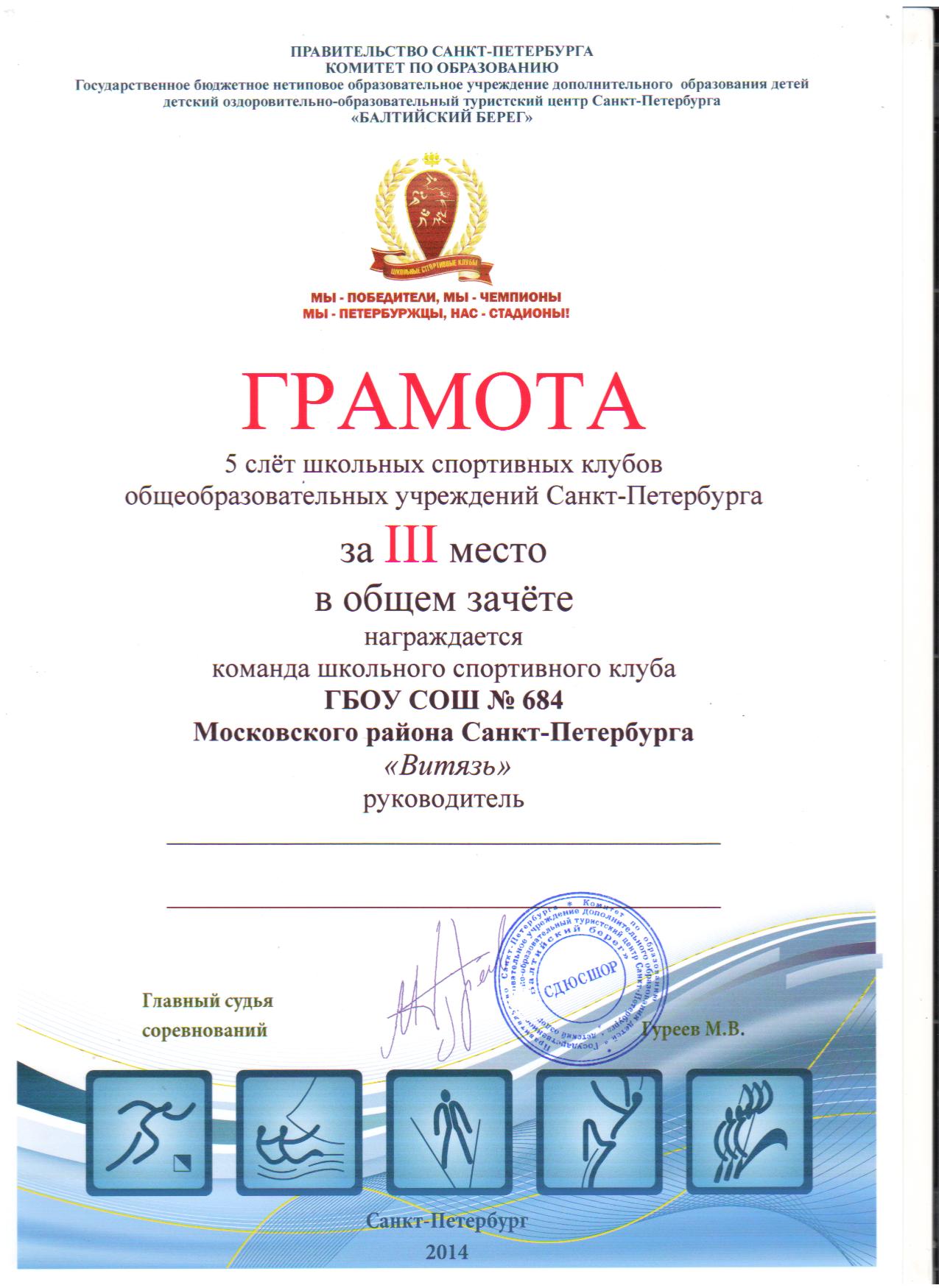 17-19 сентября 2014 года на базе ДООЛ «Заря» Детского оздоровительно-образовательного туристского центра Санкт-Петербурга «Балтийский берег» был проведен Пятый городской слет школьных спортивных клубов Санкт-Петербурга.