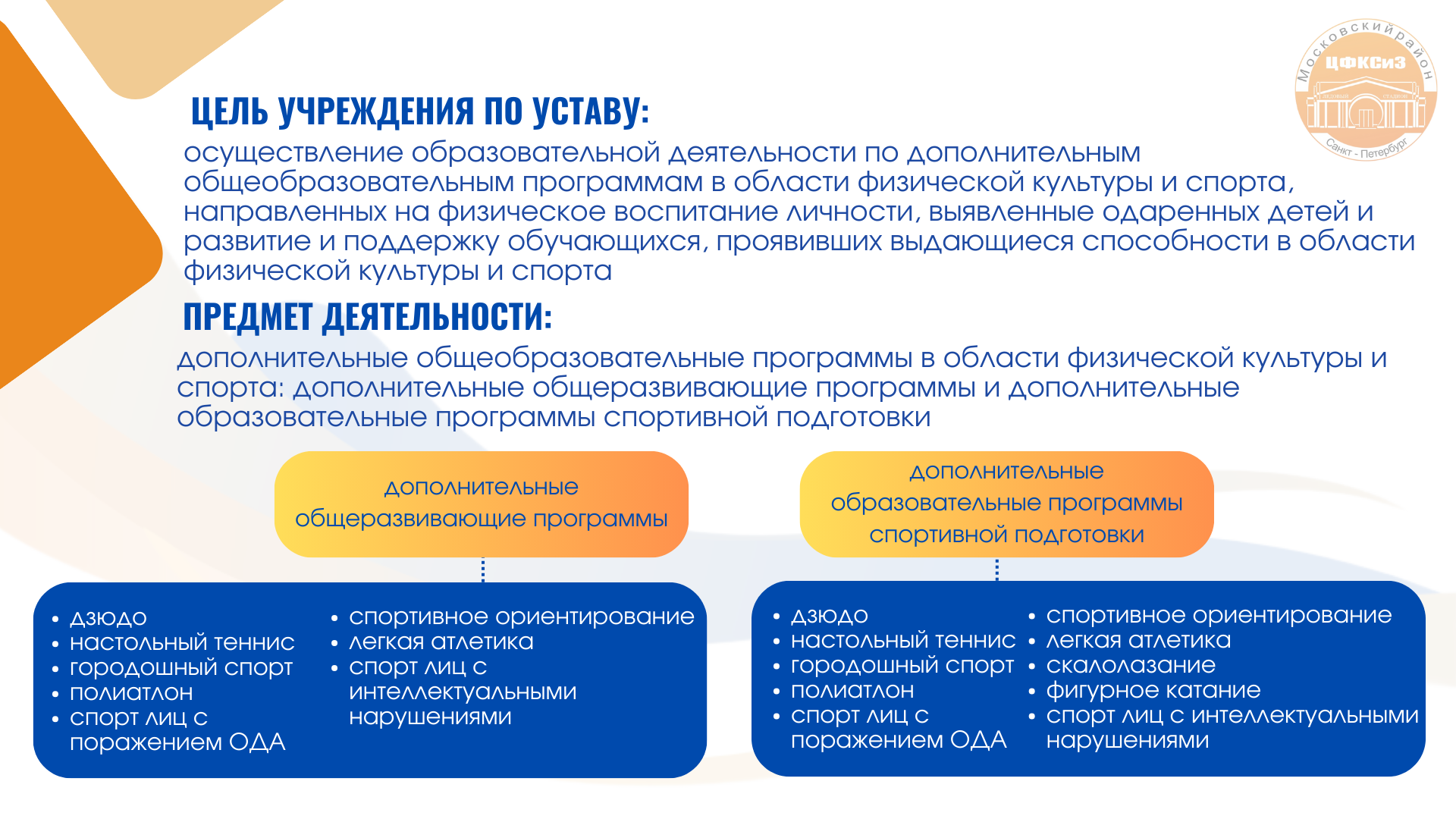 Образовательное учреждение реализует дополнительные общеобразовательные программы в области физической культуры и спорта и дополнительные образовательные программы спортивной подготовки.