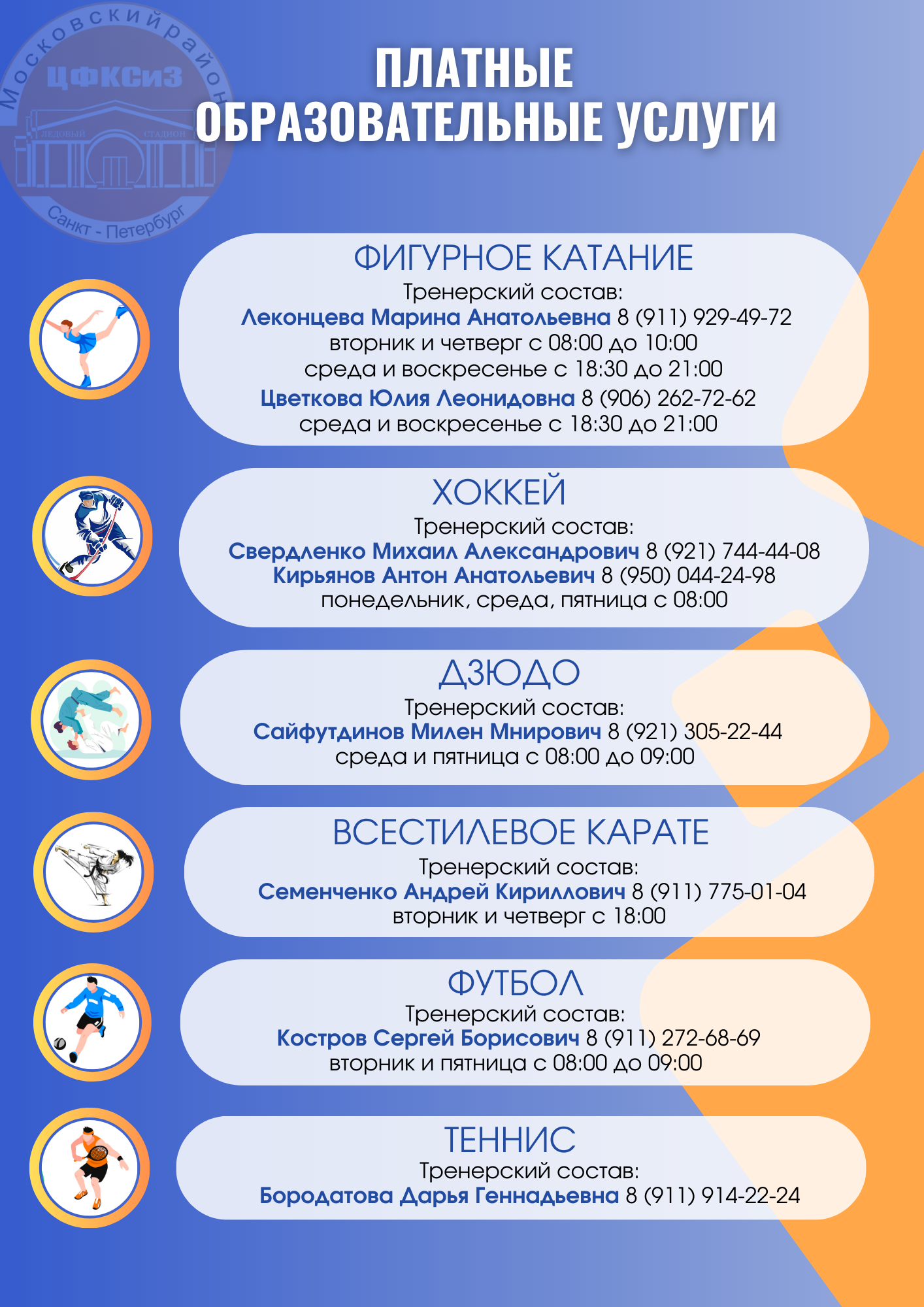 Занятия проводят опытные педагоги, тренеры высшей квалификации, мастера спорта, участники и призеры международных соревнований.